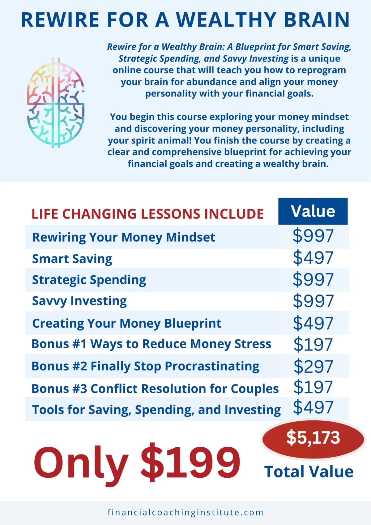 Rewire for a Wealthy Brain Course is a five-module training program that gives you the clarity and confidence to really take control of your finances.